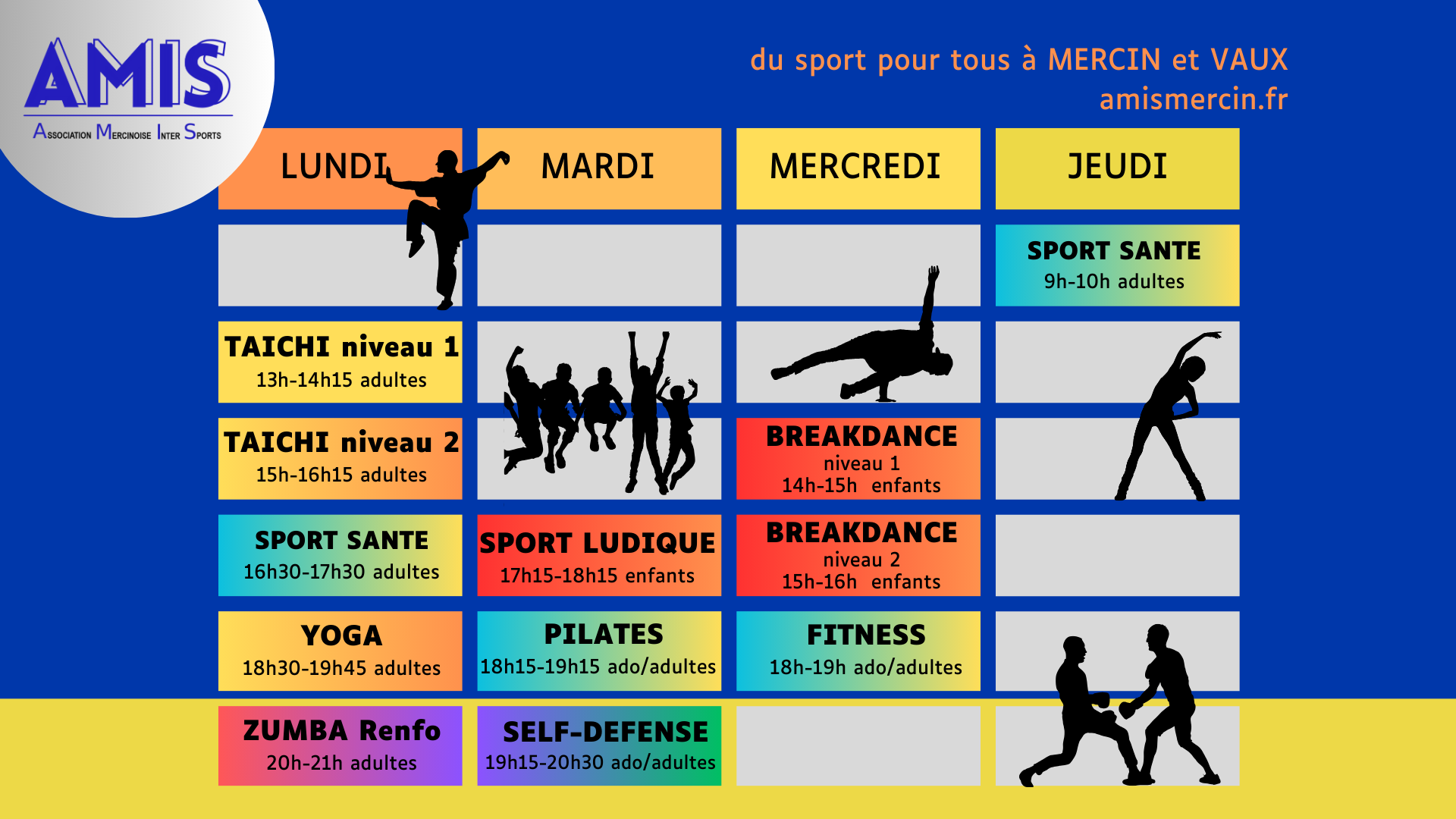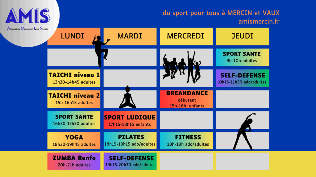 Sport pour tous à Mercin et Vaux Bien-être & Convivialité avec l'AMIS Nous retrouver sur Facebook RENTREE SPORTIVElundi 8 septembre 2025 2 nouvelles activités à partir du 30 septembre !PILATES et SELF-DEFENSEPré-inscription vivement recommandée Breakdance débutant Fitness pilates Sport Santé sport ludique enfants SELF-DEFENSE Taichi Yoga ZUMBA Renfo De septembreà juin Espace Chemin vert à Mercin et Vaux 2 séances d’essai par activité tout au long de l’année Les petits plus vous pouvez régler les cotisations en plusieurs foisles licences donnent droit à des réductions fiscalespour les fratries, une réduction sera appliquéeen cas de multi-activités, une réduction sera appliquée Pour toute information supplémentaire, n’hésitez pas à nous contacter ! NOUS contacter Breakdance débutantFitnessSelf-défenseSport ludique enfantsSport SantéTaïchiYogaZumba Renfo Merci à nos partenaires